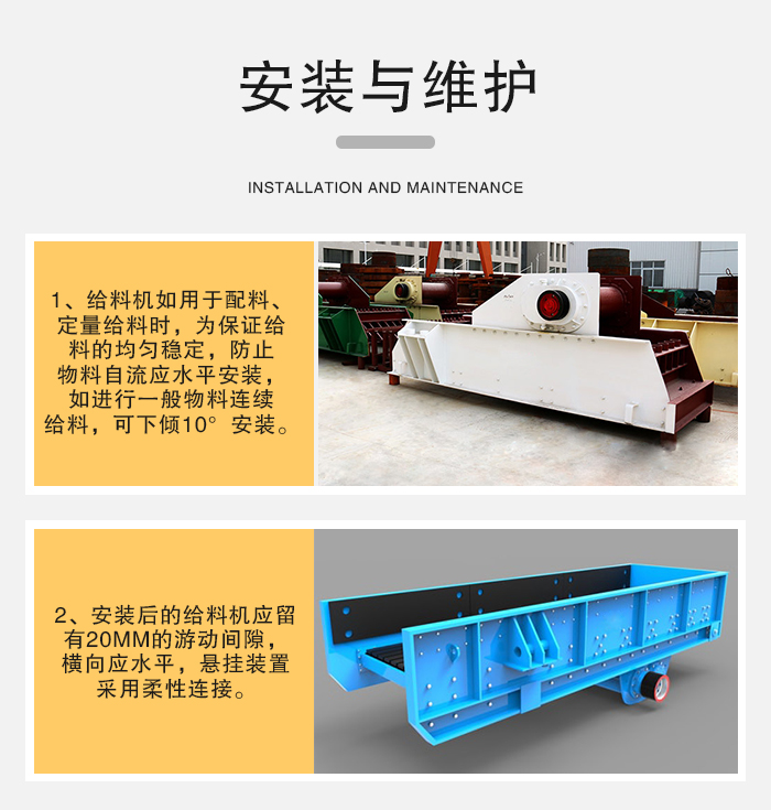 b、安裝后的給料機(jī)應(yīng)留有20mm的游動間隙,橫向應(yīng)水平,懸掛裝置采用柔性連接。